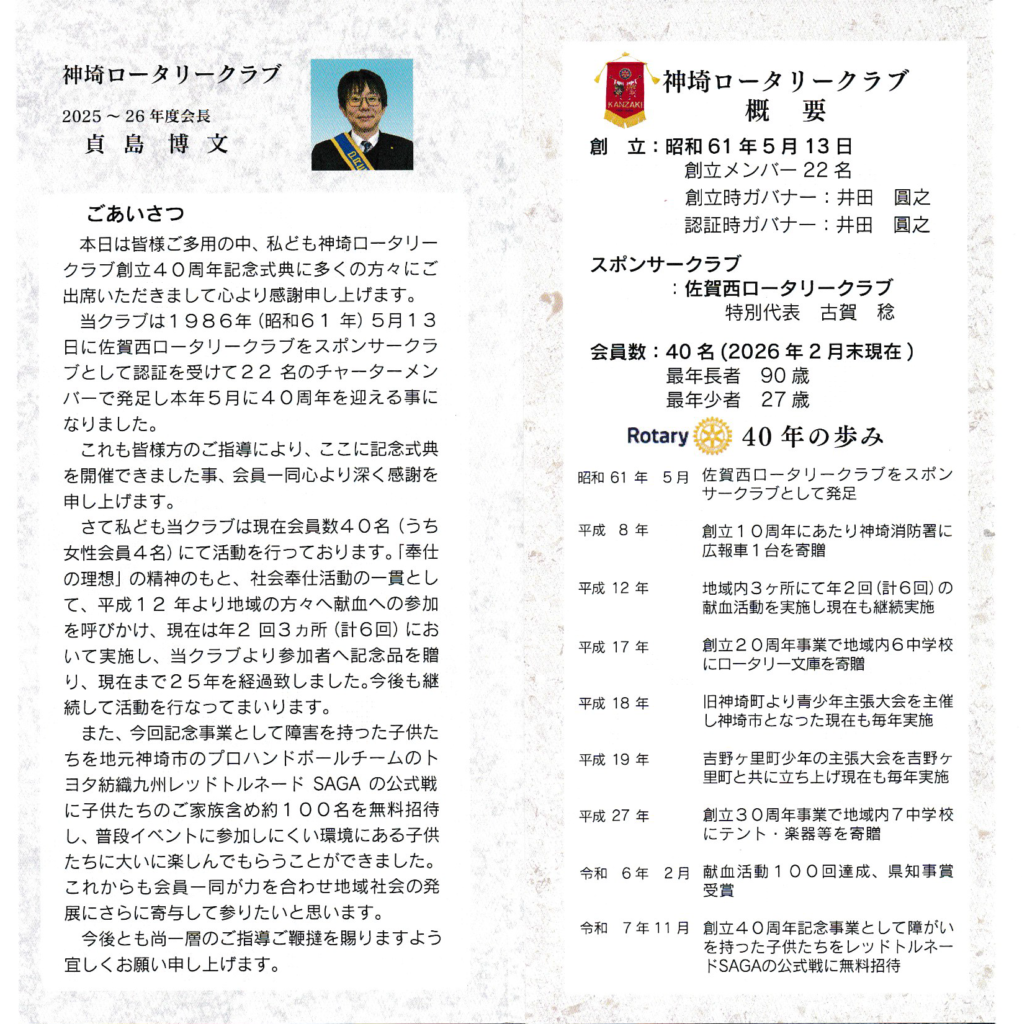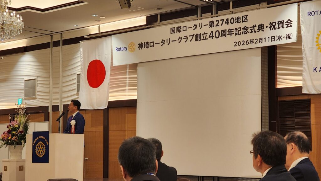 神埼ロータリークラブ創立40周年記念式典・祝賀会 2026年2月19日 最終更新日時 : 2026年2月19日 admin 【神埼RC 創立40周年】我がクラブがスポンサーとなり誕生した 神埼ロータリークラブの創立40周年記念式典が盛大に挙行されました 2026年2月11日 ホテルマリターレ創世(撮影 松本一君、亀井祐治君)